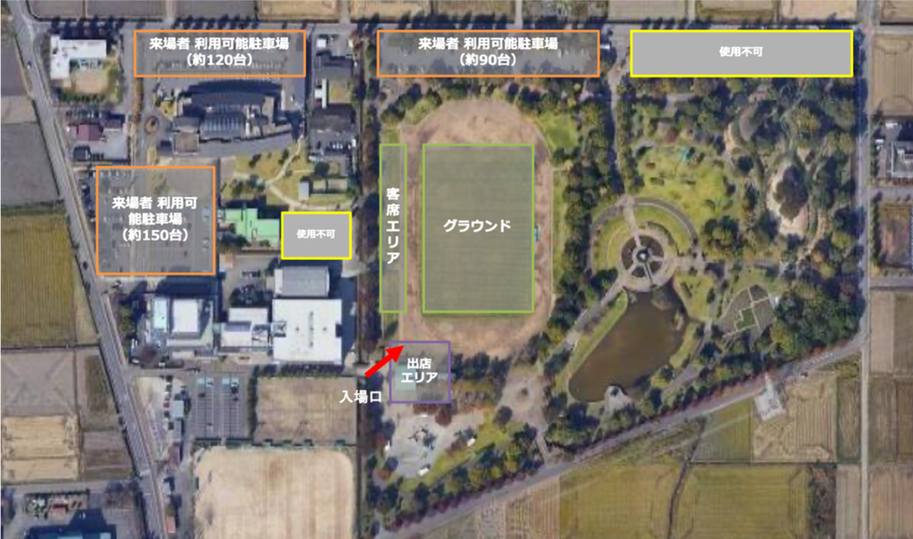 試合日当日は、指定された公園内・隣接する役場の駐車場をご利用ください。