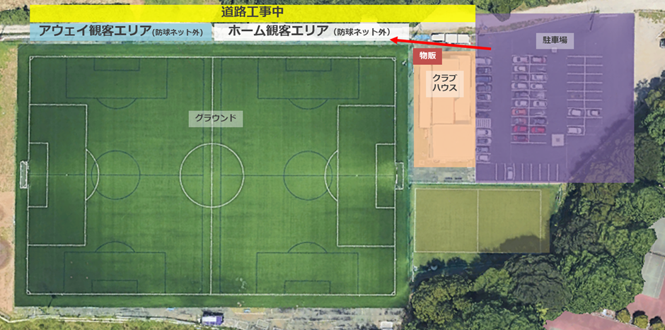 当日は、観客席を「HOME観客エリア」「AWAY観客エリア」に区画いたします。防球ネットと道路沿いの柵との間のスペースが観戦エリアとなります。