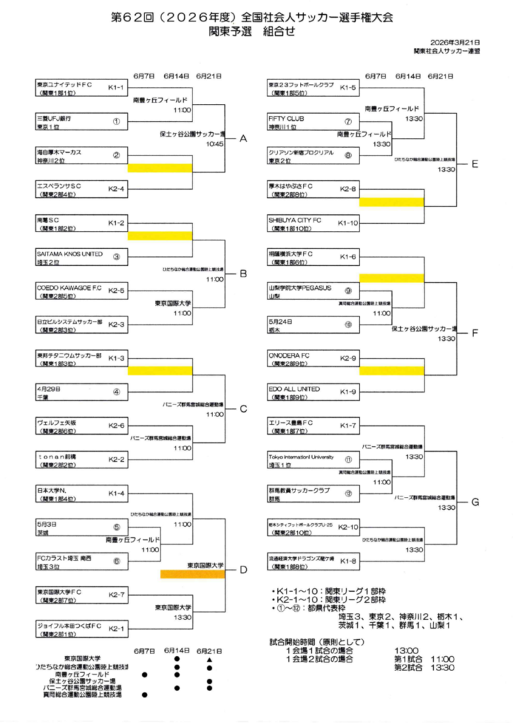 この度、第62回(2026年度)全国社会人サッカー選手権大会 関東予選の組み合わせが発表されましたので、下記の通りお知らせいたします。