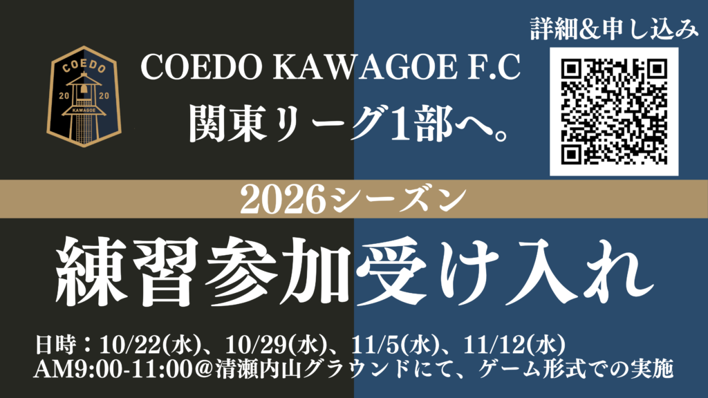 埼玉県川越市からJリーグを目指す、COEDO KAWAGOE F.Cではチーム強化を目的とした2026シーズンに向けた選手の、練習参加受付を開始いたします。(※セレクションは年内に別途複数回開催予定です。)
