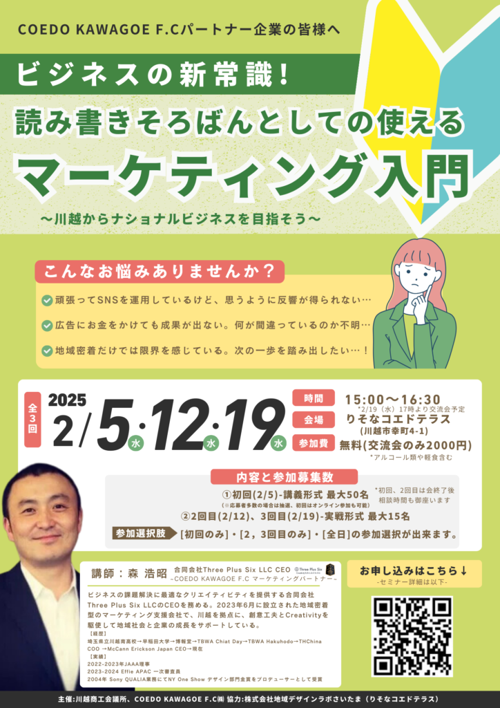 「今シーズンも合同会社Three Plus Six LLC様とオフィシャル・マーケティングパートナーとして歩まさせていただくこととなりました。昨年度も、以下にも記載ある通り包括連携協定を結ばさせていただいております川越商工会議所様と共に会員企業様や弊社のパートナー企業様向けに川越地域の企業価値を高めていく活動としてマーケティング✖ブランドの実践取り組みを行って参りました。今シーズンも活動の軸をぶらさずより一層のアップデートを通じ合同会社Three Plus Six LLC様と価値の提供を行って参る所存です。」