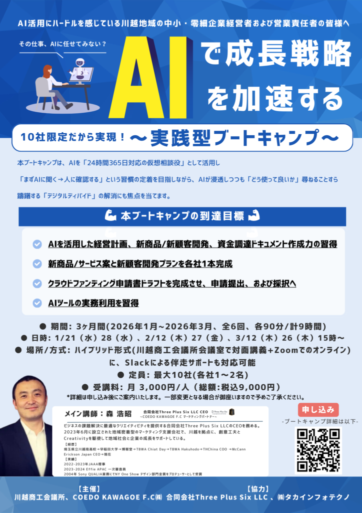 COEDO KAWAGOE F.Cを運営するCOEDO KAWAGOE F.C株式会社(埼玉県川越市、代表取締役 有田和生)は、ビジネスの課題解決に最適なクリエイティビティを提供する合同会社Three Plus Six LLC(埼玉県川越市、CEO 森 浩昭 )と2026シーズンのオフィシャル・マーケティングパートナー契約を更新したことを発表いたします。