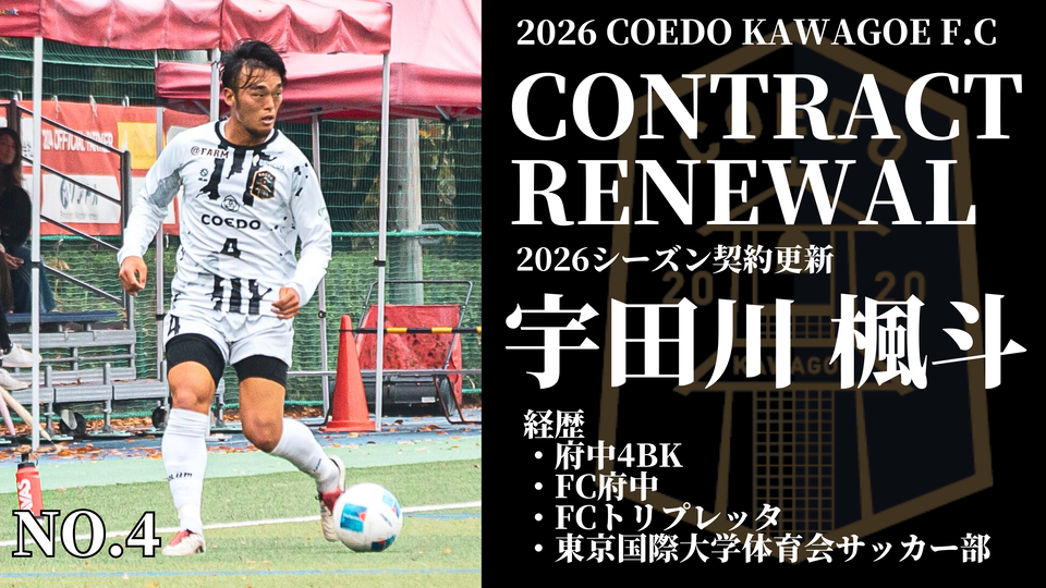 「来シーズンもCOEDOKAWAGOEF.Cでプレーすることになりました。宇田川楓斗です。今シーズンは昨シーズンに比べて出場ができなくて、悔しい思いをしました。来シーズンは関東1部リーグに昇格し、個人としてもたくさん試合にからめるように頑張って行きたいと思います!そしてまた、ファン、サポーターの方々といい景色が見れるように全力で戦います!宜しくお願いいたします!」