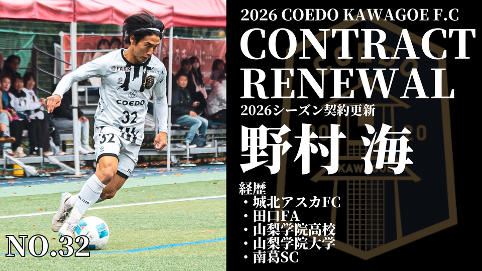 この度、野村 海選手(No.32)が2026シーズンの契約更新することが決定いたしましたのでお知らせいたします。