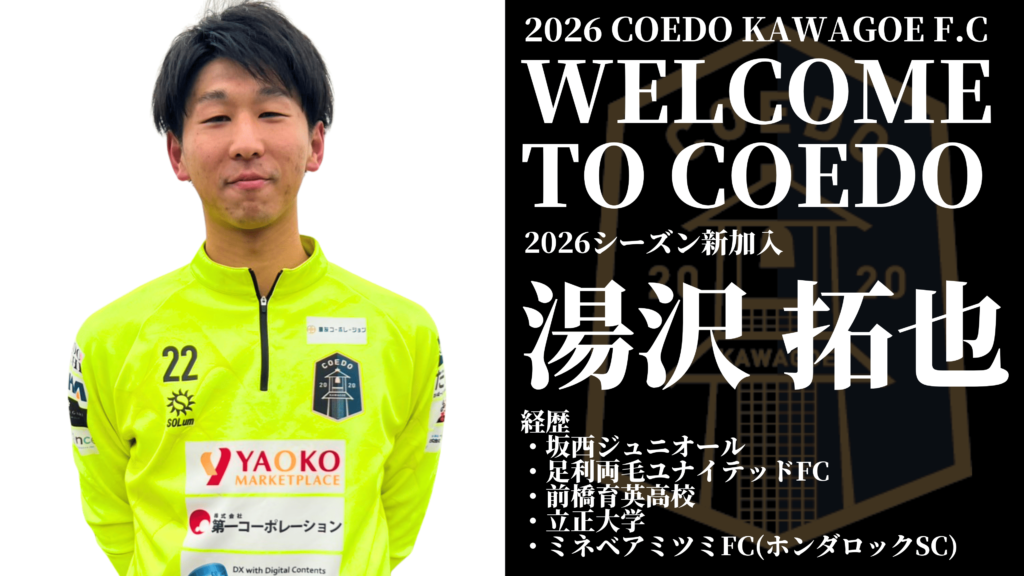 この度、2026シーズンより、JFLに所属するミネベアミツミFCより湯沢 拓也選手がCOEDO KAWAGOE F.Cへ加入することが決定しましたので、お知らせします。