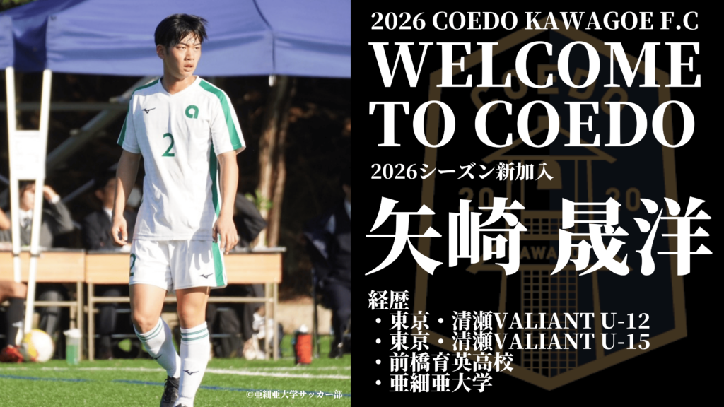 この度、2026シーズンより、関東大学サッカー3部リーグに所属する亜細亜大学サッカー部より矢崎 晟洋選手がCOEDO KAWAGOE F.Cへ加入することが決定しましたので、お知らせします。