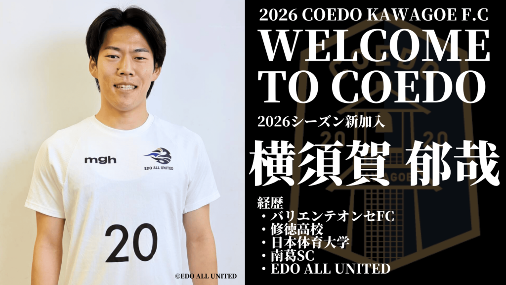 この度、2026シーズンより、関東2部に所属するEDO ALL UNITEDより横須賀 郁哉選手がCOEDO KAWAGOE F.Cへ加入することが決定しましたので、お知らせします。