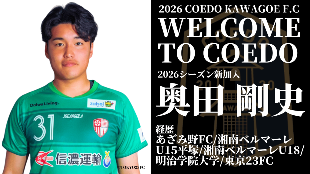この度、2026シーズンより、関東1部に所属する東京23FCより奥田 剛史選手がCOEDO KAWAGOE F.Cへ加入することが決定しましたので、お知らせします。