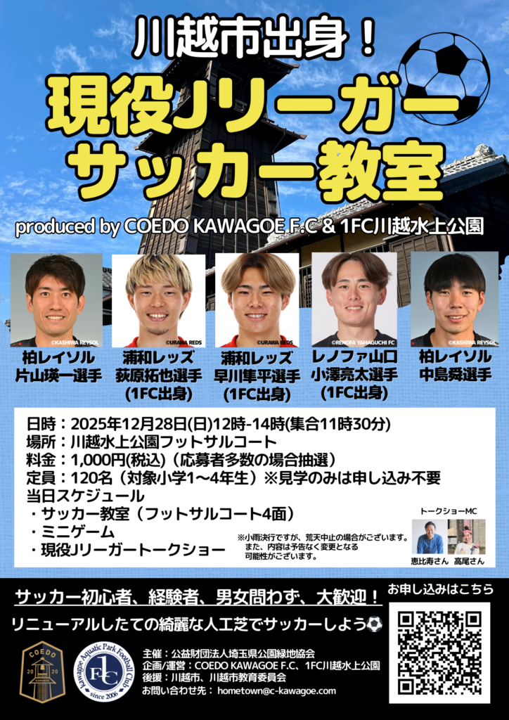 昨年開催時も好評いただき、120名の参加枠に対して、約200名ほどのご応募をいただきました、川越水上公園で現役Jリーガーを招いてのサッカー教室企画ですが、2025年度も12月28日(日)12-14時(11時半集合)にて開催が決定しましたのでお知らせ致します。