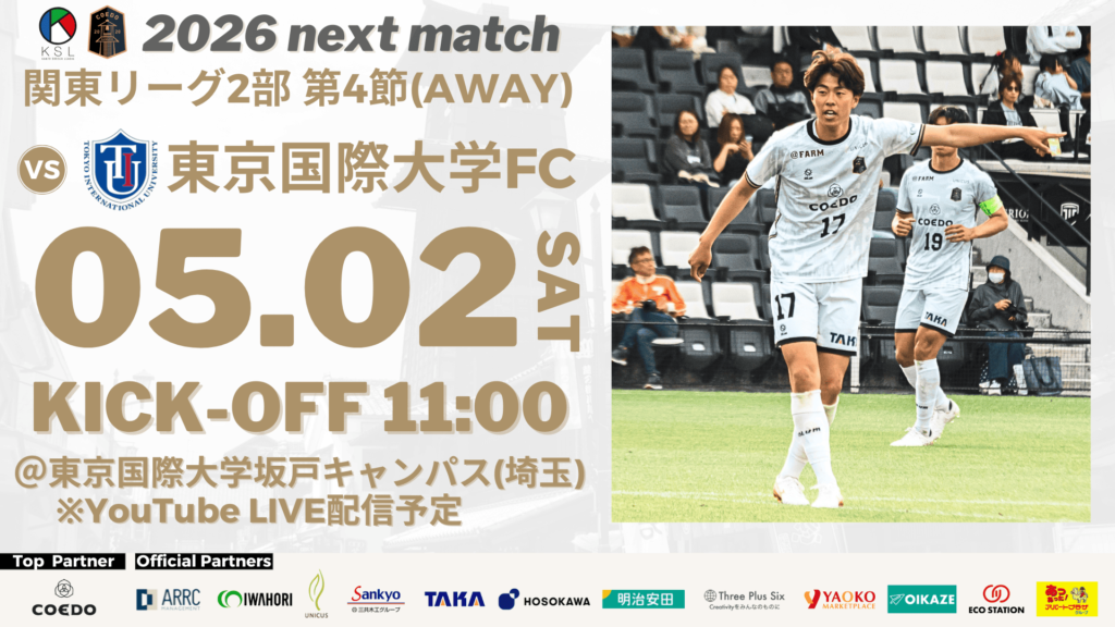 【関東2部リーグ 第4節(AWAY)】vs 東京国際大学FC(関東2部)@東京国際大学坂戸キャンパス第2サッカー場
